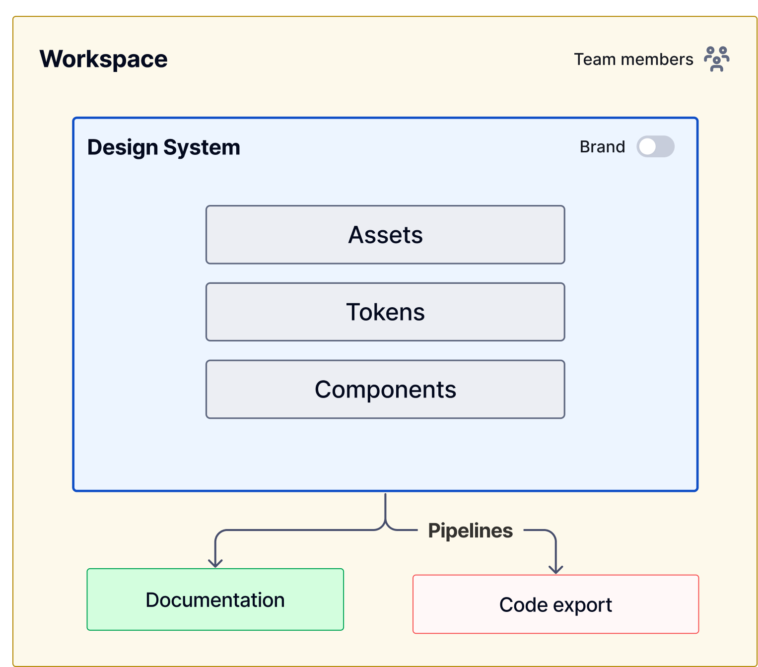 A workspace is the core of your design system ecosystem in Supernova. It is where your team works, and your viewers consume the design system. Inside a workspace, you can host multiple design systems, each housing elements like components, assets, and tokens. Each design system can have a single documentation website, which we'll discuss in more detail later.