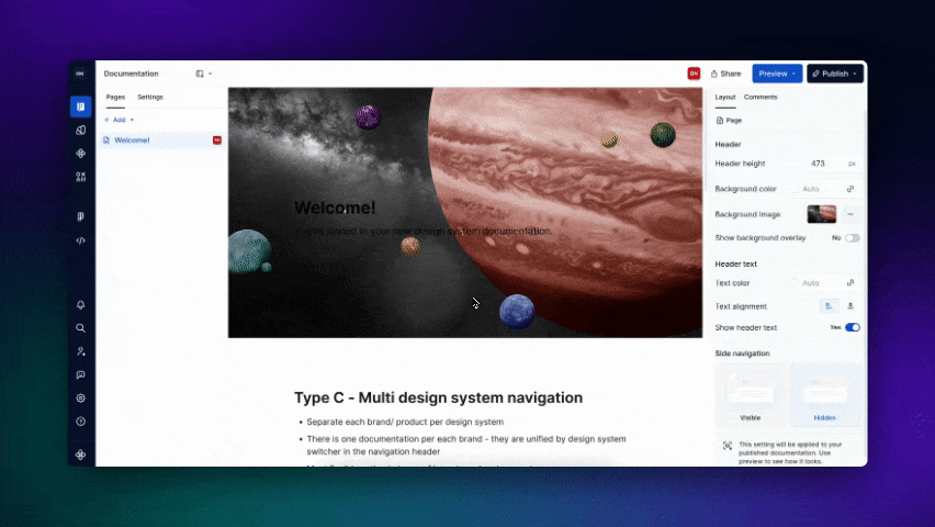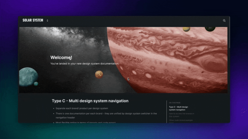 Publish each of the documentation, and you should be able to access the different design systems through the main navigation. This also enables URL matching, so your design system consumers will be able to navigate through the same content type across the different brands without losing context.