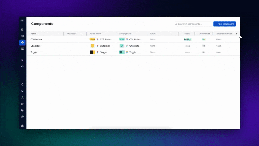 Also, in the component manager, create new custom properties to document the components for each of your brands. Then, showcase these components in the documentation using the "component table" block.