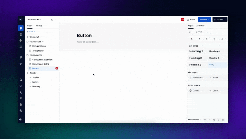 Documenting these themes is simple. You select them in the token blocks and use the block properties to show them in a split view or override the base to display the themes individually for each brand. Other elements, like components and assets, can be uploaded to the design system under design data.