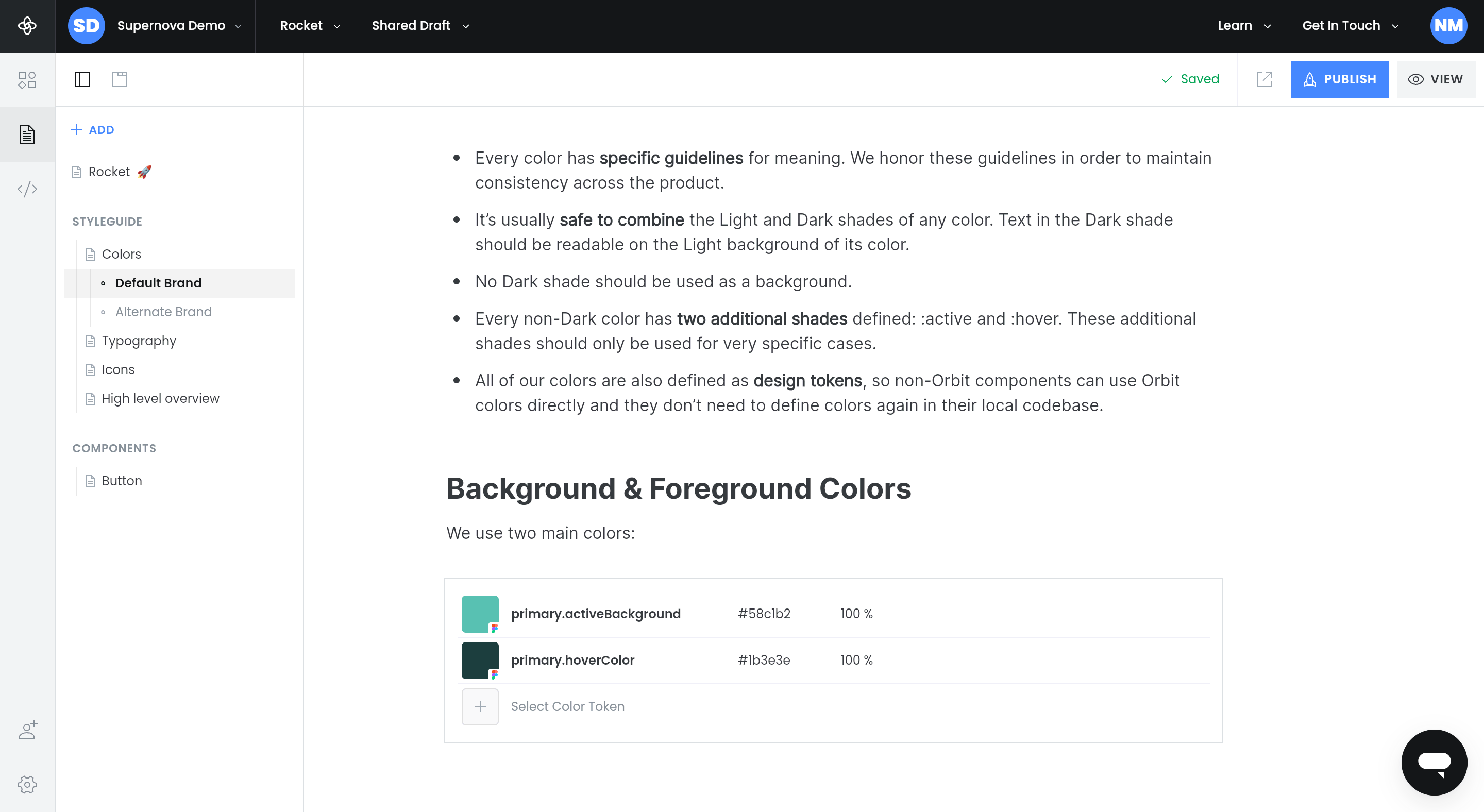 Your style guide helps you break down your different design elements and explain how to use them. This helps you promote consistency and makes it easier for you team to interact with your designs. From Supernova you can create sections depending on your design tokens, assets, or any other categories that suit your design system. Using Figma content blocks you can integrate specific design data and document them thoroughly. Here’s an example from our demo design system explaining the use of colors.