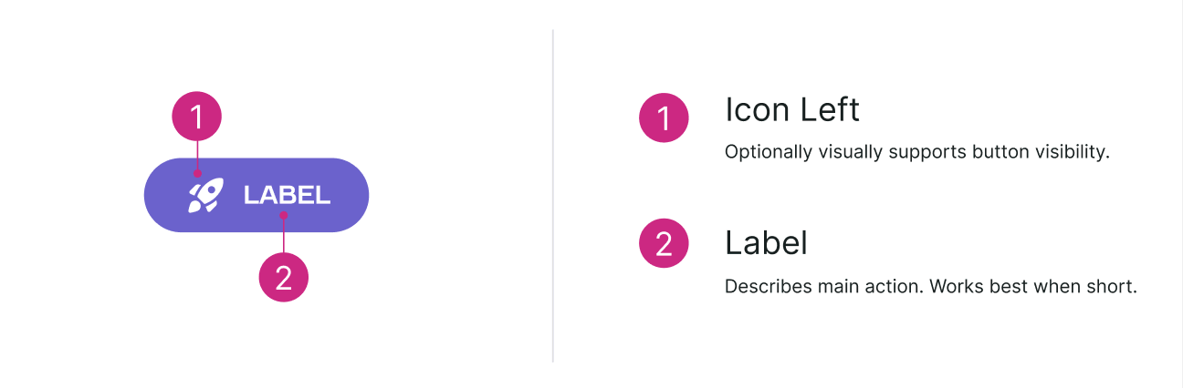 This button is a collection of different elements — a pill-shaped layer, an icon, a string of text, a background color, typography, and text color. And since it will be used throughout your product you need consistency — by building a design system using components like these. But naturally as a designer your product might have different variations of the same component. This is why design systems need more than just the component, but also the guidance on how to use or alter it. Taking our button again as an example, here’s a breakdown example.