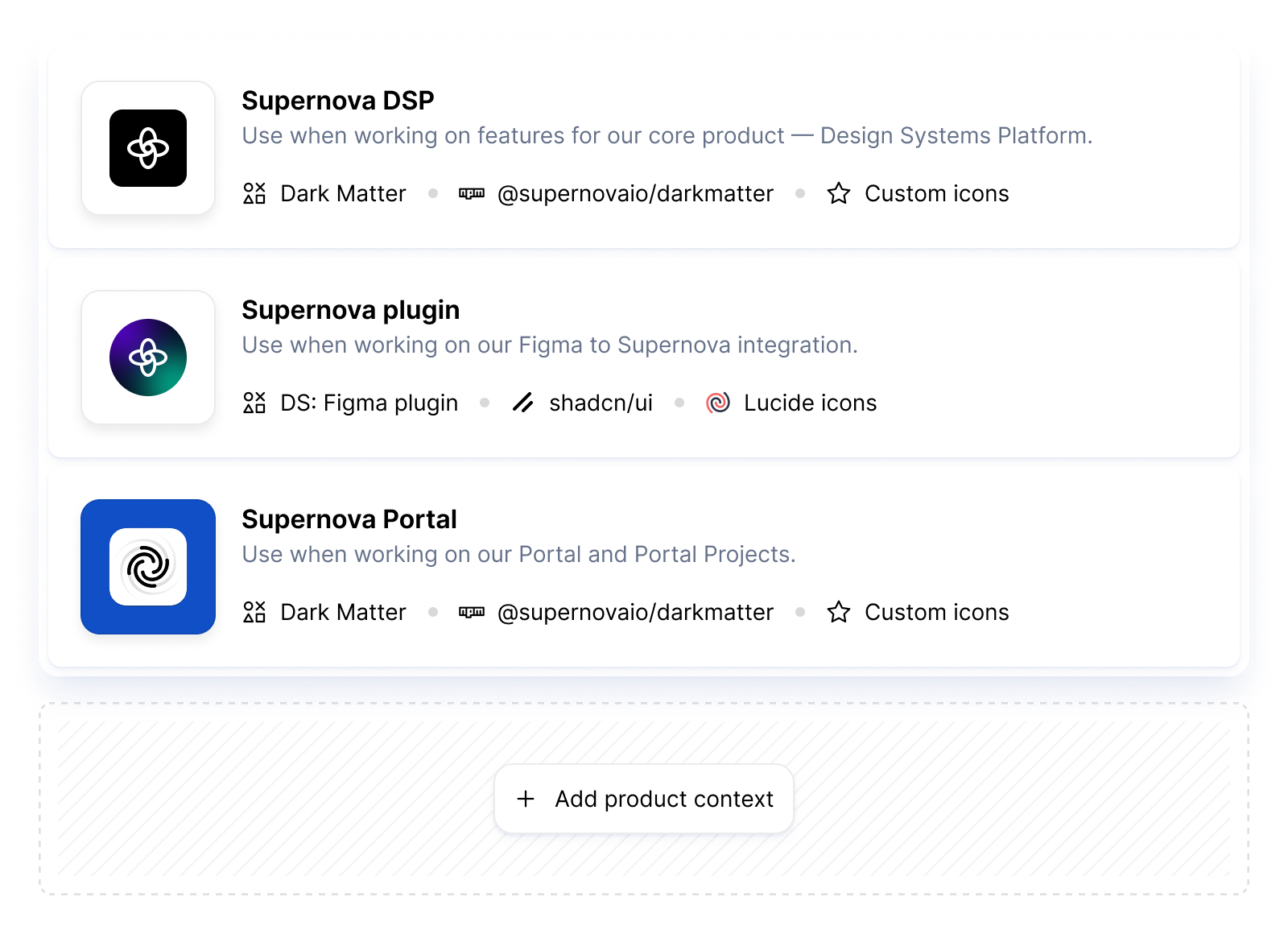 Supernova 3.0 also introduces "product contexts"—reusable setups tied to your design and code libraries, brand guidelines or even formalized design systems, if you have them. With product context, every feature is visually consistent, so you don’t spend half of the prompts just tweaking designs or providing info about the product you're building for .