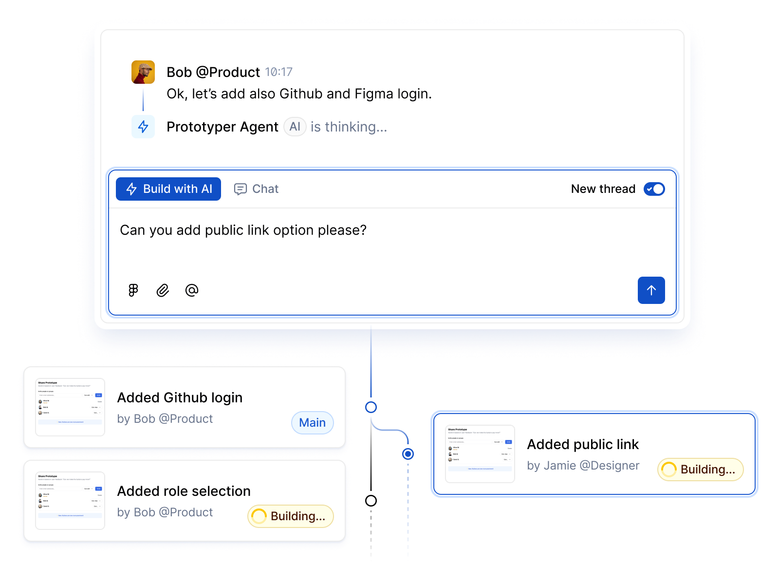 Threading, branching, and merging keep the back-and-forth smooth—explore ideas in parallel without conflicts, then blend the best into the main flow. It's like Slack for product work: everything's multiplayer, with real-time visibility so everyone sees the same updates.