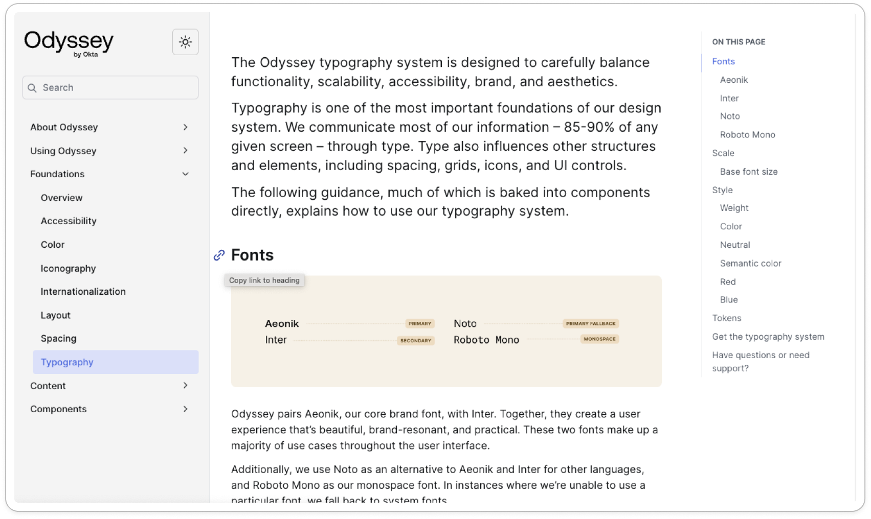 Headers might seem basic, but they're essential for long pages of content because they greatly improve navigation. Link directly to a header when referencing a specific part of your design system documentation to send people to the right place. Plus, there’s a breadcrumb menu on the right of each page, so users can easily follow along or jump to a different section of the page.