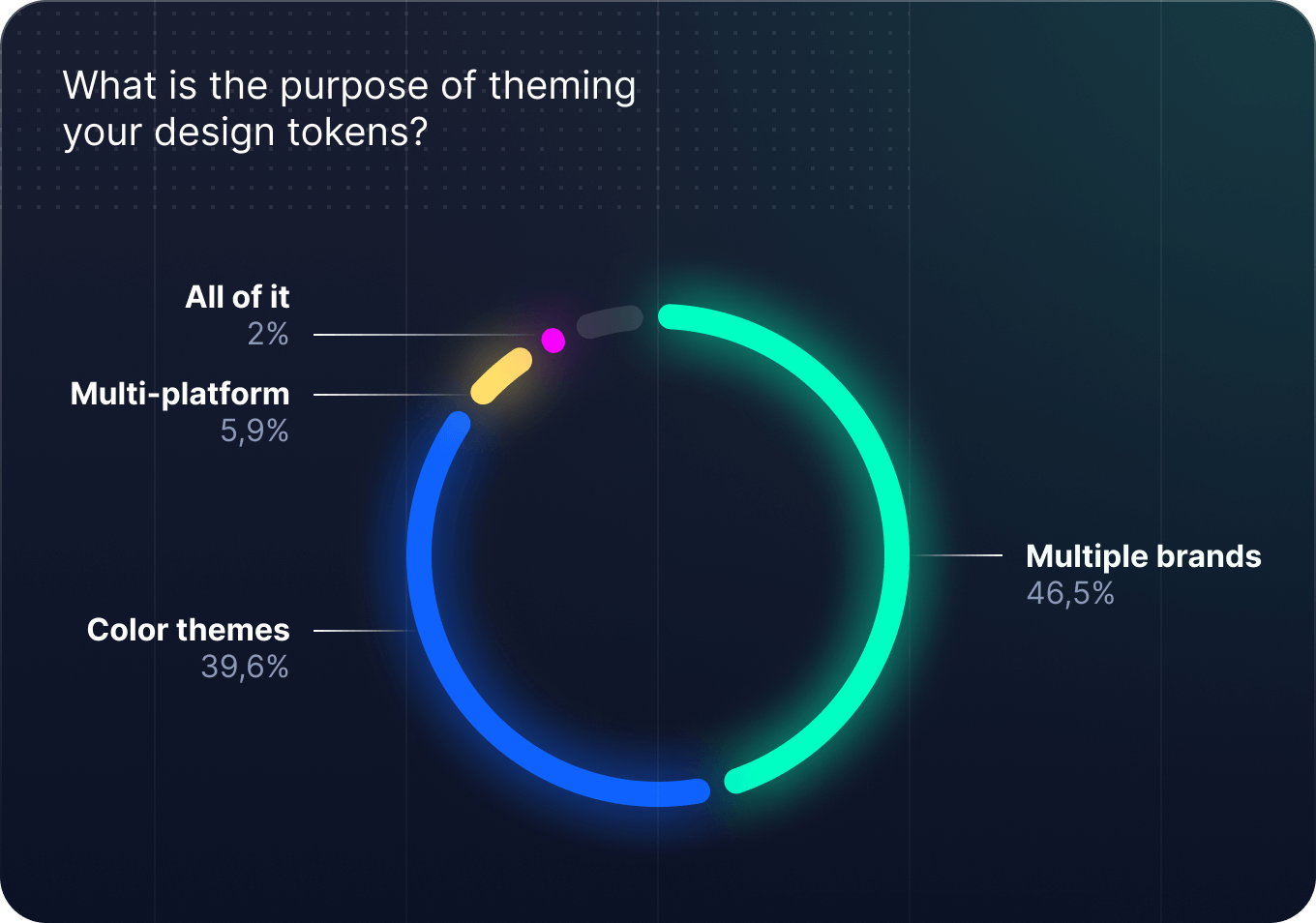 47% do it to support multiple brands or products, 40% do it to support different color schemes like dark/light mode, and 6% do it to support multiple platforms like iOS/Android. With a majority of users either implementing or looking forward to it, it seems design token theming will grow to be an essential soon enough.