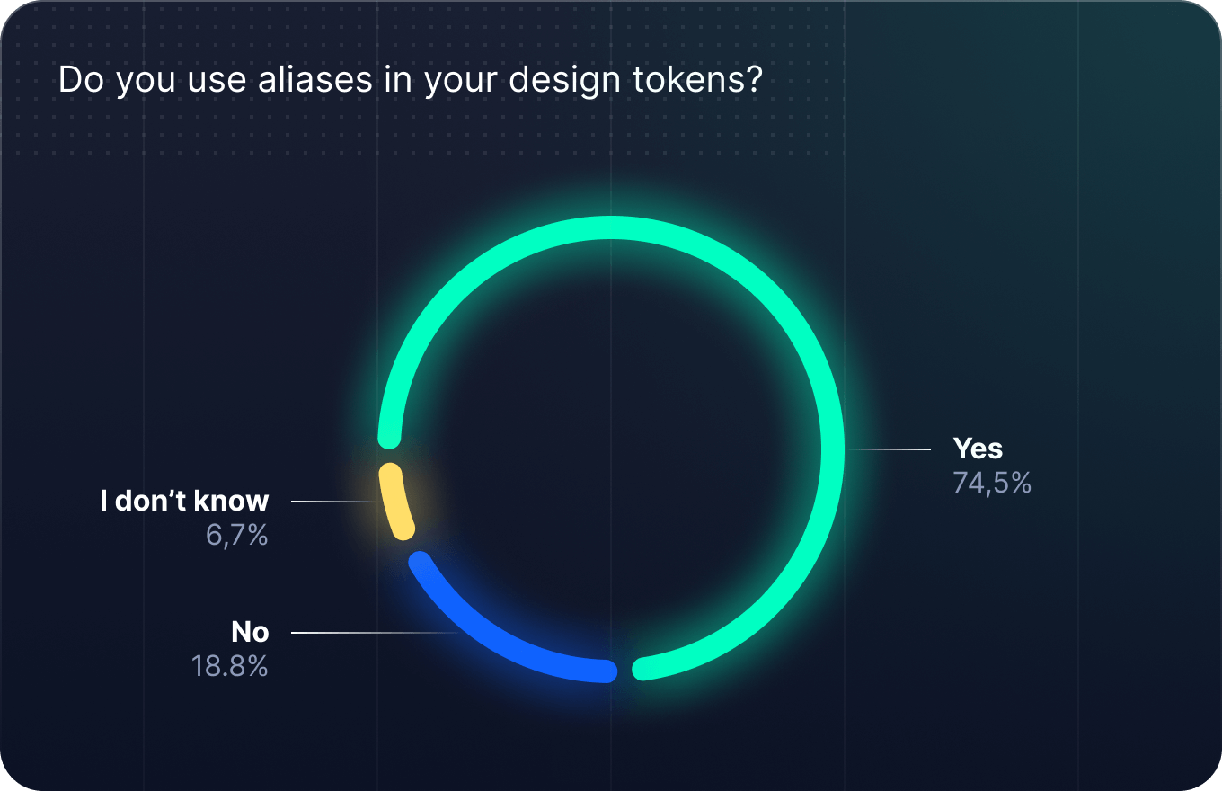 Another creative use case of design tokens is to use aliasing, which is using a design token as a reference to another token. This helps designers and engineers makes changes that automatically reflect across the board without having to change implementation. Respondents seemed to agree with 75% of respondents saying they use aliases in their design tokens.
