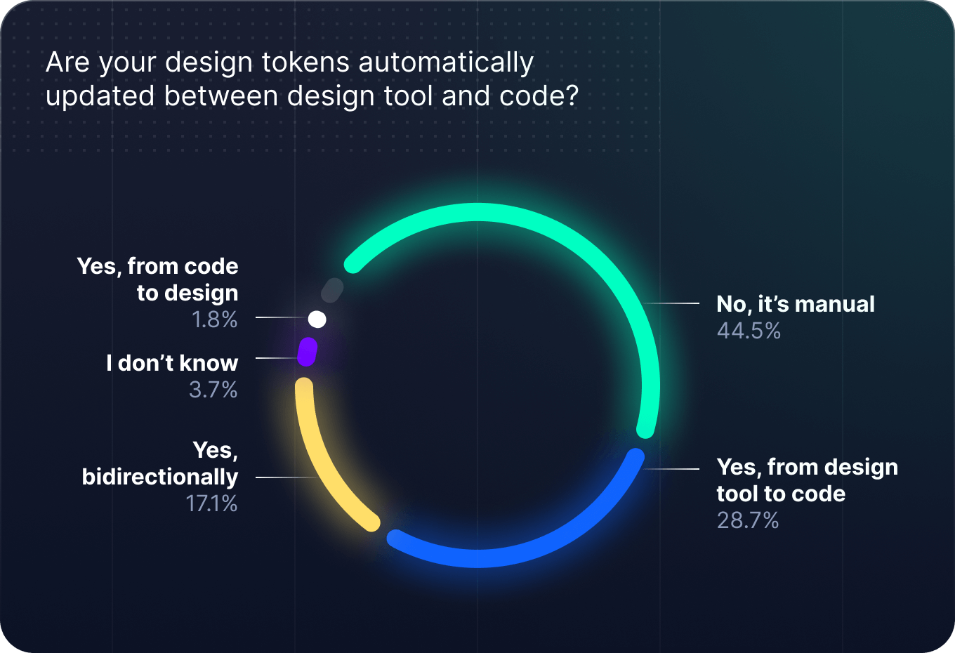 Whether designers or developers manage design tokens, they’re constantly interacting with each other. This is the design handoff process, which typically flows from design (with designers) to implementation (with developers) but can also flow bidirectionally. We asked respondents if they have an automation system for handoff or if they’re still doing it manually.