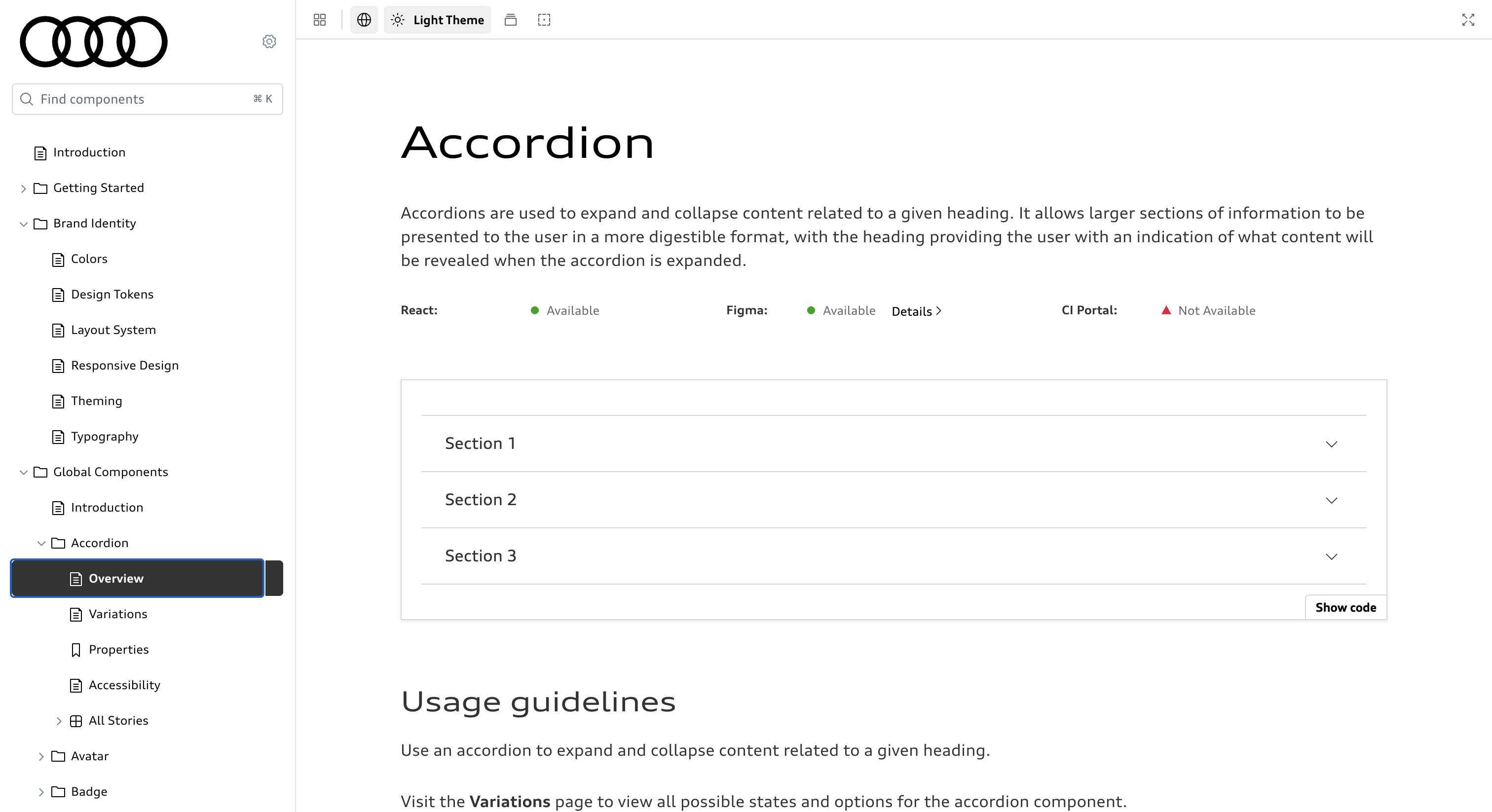 Audi uses Storybook to maintain a unified design system across its digital ecosystem, including websites, mobile apps, and in-vehicle interfaces. By embedding Storybook into their design and dev workflows, they’ve been able to ensure UI consistency across platforms, reduce redundant effort, and accelerate development cycles. The result is a scalable component library that supports Audi’s global digital presence.