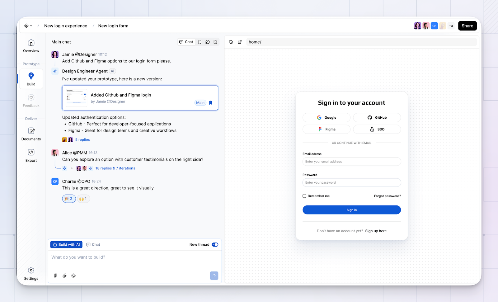 Create AI closes that gap. You can style prototypes using your actual design tokens and documentation context, and prototype using your real component code library, not a parallel universe of one-off components.