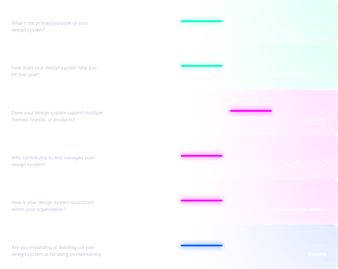 The Mapping Test helps categorize your design system with a set of scales. So the first order of business was to see what respondents chose as their design system. We sorted through all the data from the test and got the average definitive scales that reflect design systems today.