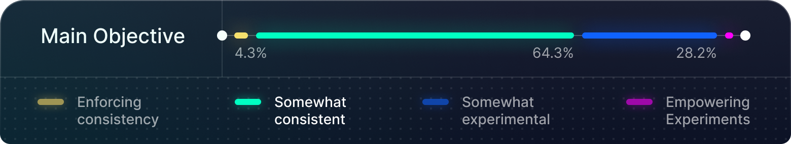 The Mapping Test revealed that consistency remains a top priority for design systems, with 96.8% of respondents indicating it as part of the main objective. But interestingly, a whopping 92.5% of respondents agreed their design system aims to balance consistency with experimentation with a majority 64.3% leaning on the side of consistency.