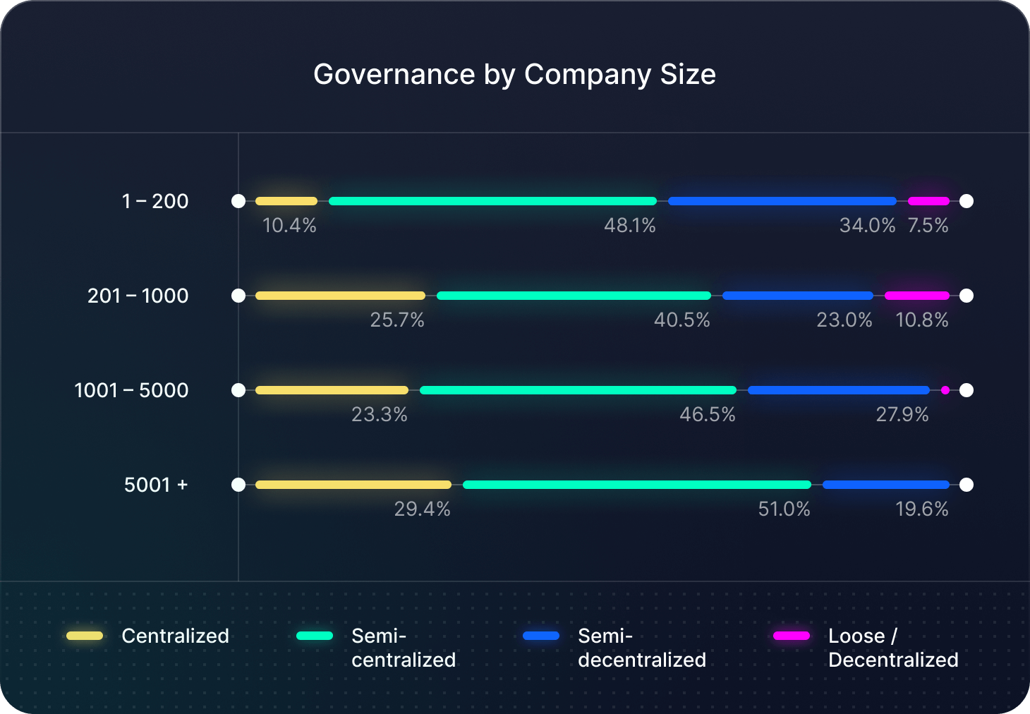 Naturally, the scale of a company has an impact on the scale of a design system. So when it comes to governing a massive design system, the results look a bit different. A completely decentralized design system would be a tough challenge to undertake. No 5000+ person company had a completely decentralized governance model. They also had a much larger 80.4% centralized preference compared to smaller company sizes.