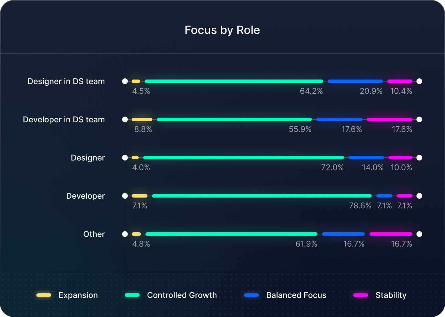 The data shows that 85.7% of developers agree that expansion is their main focus, compared to 64.7% of developers within a design system team which is closer to the average. But this means that those working on design systems need more alignment with their consumers on their design system and what it's trying to achieve.