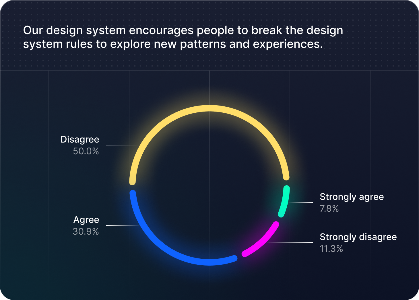 We weren't sure if design systems were at a point where they could loosen up on strict consistency rules and empower their consumers to experiment. But to our surprise, a significant 38.7% of respondents agreed that their design system encourages them to break the rules and create new patterns and experiences.