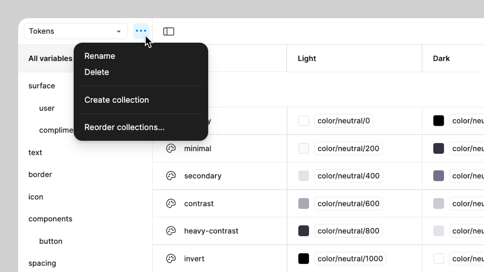 Collections in Figma are like folders for your variables. They also control which modes apply to which variables — so they’re more than just organizational tools.