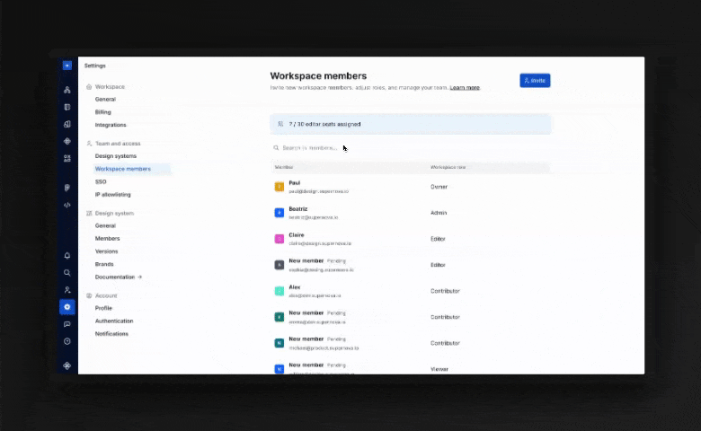 Supernova uses role-based access control at both the Workspace and Design System levels. However, in this unified setup, access isn’t limited to specific brands or sections—so it’s important to set up your roles and workflows to ensure accountability.
