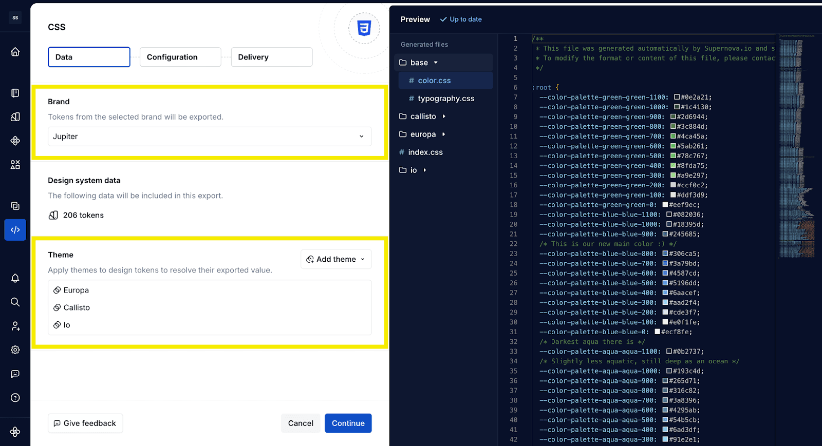 Once your token architecture is mapped and organized by brand, it’s time to bring automation into the picture. Supernova allows you to build dedicated export pipelines for each brand, so you can deliver tokens and assets directly into your codebases—fully automated and completely customized per platform, brand, or product area.