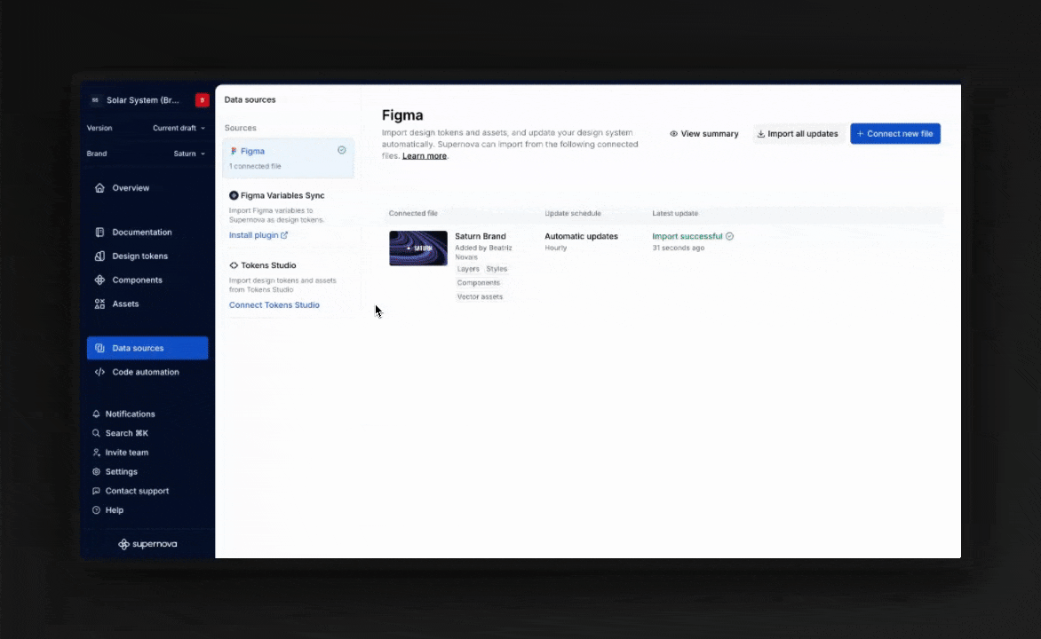 When working with multiple brands or themes, Supernova’s Figma Variables Sync plugin makes it easy to bring structured design data into your system. This plugin allows you to sync collections and modes from Figma directly into Supernova, where they become fully manageable design tokens. It’s an essential part of making your multi-brand setup functional and future-proof.