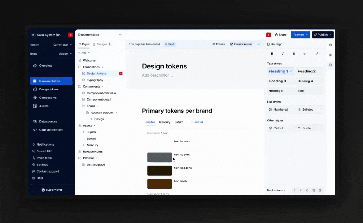 One of Supernova’s features enabling this unified approach is the Brands feature. It helps you structure and scale your system within a single design system by separating tokens, components, and documentation by brand, product, or platform.