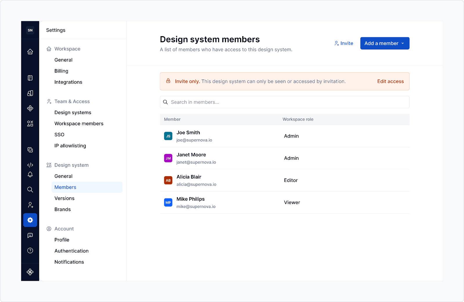 In Setup 2, it's common to have systems that are only relevant to specific teams, product areas, or external collaborators. Supernova’s Invite-Only Design Systems feature allows you to restrict access at the design system level, giving you precise control over who can view or contribute to each system.