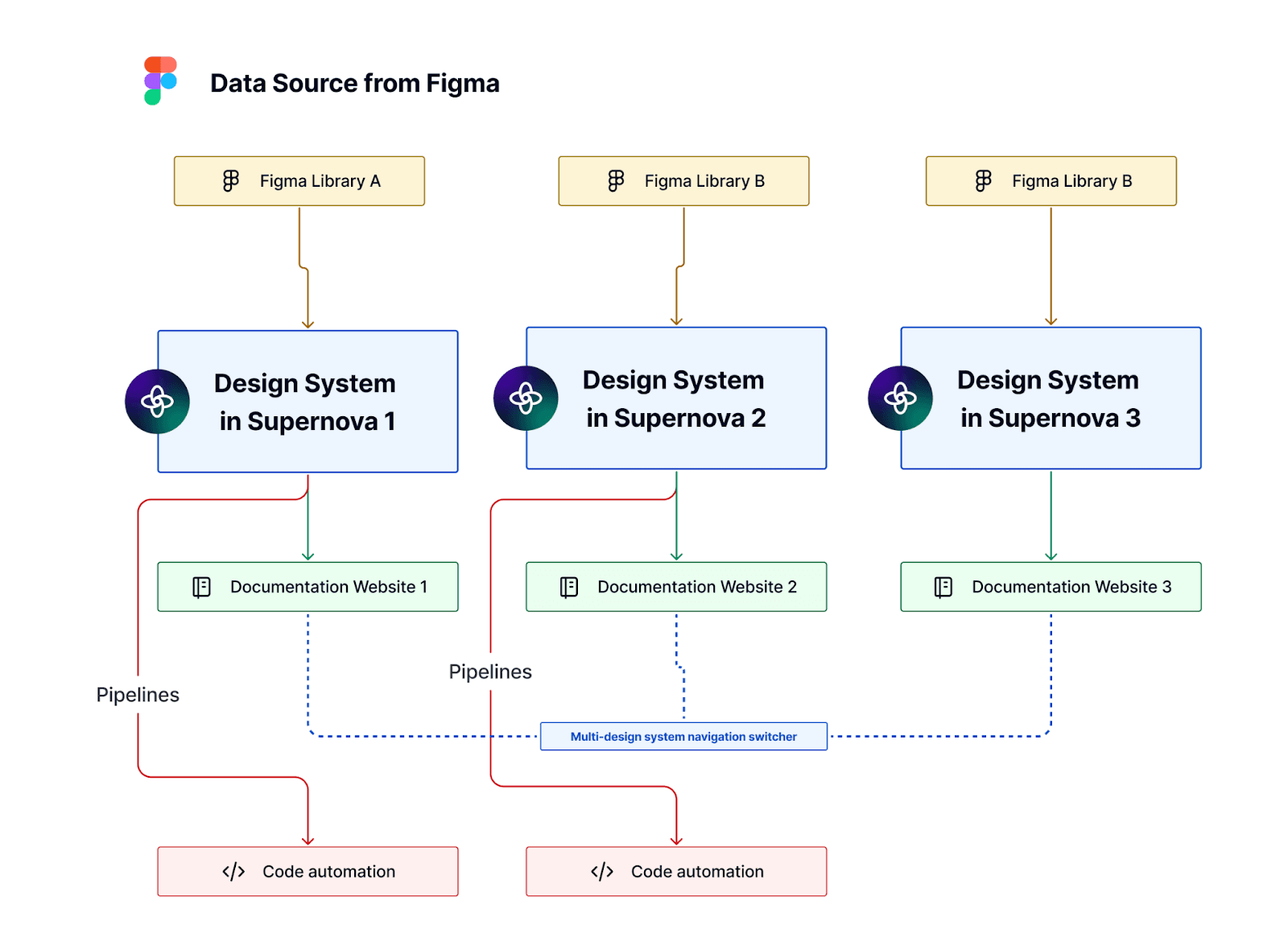- They use separate design systems in Supernova, each with its own documentation website, ensuring that each brand’s unique requirements are addressed.